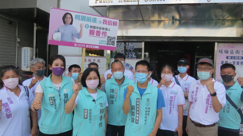 桃園市長參選人賴香伶、市議員參選人張清俊、曾姸潔與競選團隊合影。