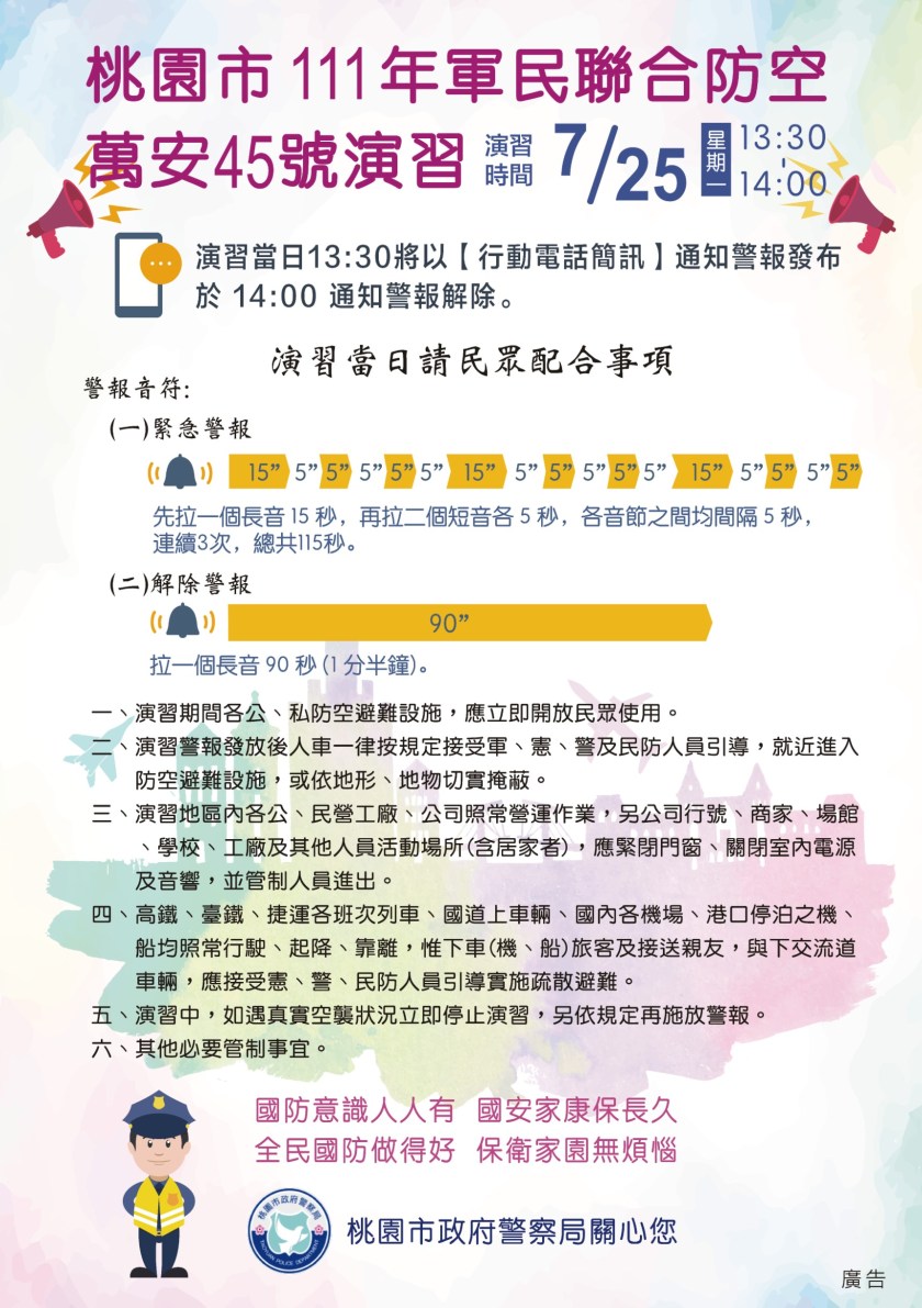 111年度軍民聯合防空「萬安45號」演習採有預告、分區方式實施,桃園市屬北部地區,訂於7月25日(星期一)13時30分至14時止舉行,實施30分鐘警報傳遞與發放、防空疏散避難、交通管制及戰災救援演練,由轄內機關(構)、學校、軍、憲、警、民防人員及民眾共同參與。