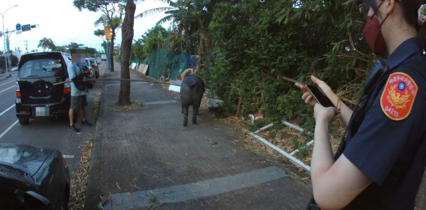 中壢分局龍興派出所警員劉炯昀、張菀芹日前18時許接獲報案稱有一頭黑豬在逛大街,警方便趕赴現場,當下見一頭黑豬正在人行道上閒逛,模樣不急不徐非常享受,讓到場的員警可就傷腦筋了,因豬隻身型巨大令張姓女警及張姓男警有些手足無措,此時一旁熱心民眾向警方提議及協助便拿起一旁竹竿將豬隻先圈住,在警、民一同合力壓制下,將這頭大黑豬圈圍在人行道上,避免豬隻四處逃竄發生意外。
