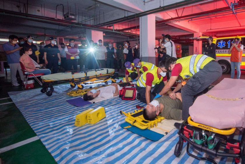 鄭文燦市長也至桃園區公所地下室視導疏散避難、傷患搶救流程及收容情形,軍警消及民防團等均積極參演;消防局也於桃園區公所前實施戰災救援演習,透過空拍機迅速掌握現場狀況,高效率指揮部署並展開高空救援作業,最終迅速撲滅火勢,成功救出受困民眾。