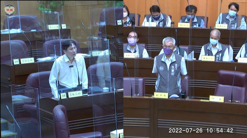 國民黨議員舒翠玲、詹江村、黃敬平今天質詢的焦點,放在7月9、10日鄭市長帶著民進黨市長參選人林智堅參訪宮廟,林智堅毫不避諱大剌剌搭乘鄭市長公務車跑行程,還有身為競選總部主委的鄭市長,由勞動局長吳宏國陪同,公然在官邸宴請機場工會人員,並協同林智堅拜票尋求支持,他們認為這些行為,已經嚴重違反行政中立並涉及賄選行為。