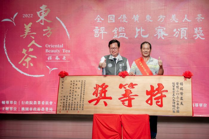 「2022年全國優質東方美人茶評鑑比賽頒獎典禮」,3日下午在桃園客家文化館舉行,鄭文燦市長致詞表示,今(111)年全國優質東方美人茶評鑑比賽參賽點數高達373點(共計3,730斤茶葉)、品質優良,不僅可提高東方美人茶的品牌價值,帶動市場行銷、創造綠金產業,同時也具有提高農民收益的效果。鄭市長說,本次比賽有來自桃園、台北、新北、新竹、苗栗等地的茶農參與,茶農皆具豐富經驗及對茶葉的愛心,每一杯茶都深具特色,鼓勵消費者一同響應、支持茶農,也鼓勵茶農二代、三代投入茶園或茶廠經營,為茶金產業帶來新希望。