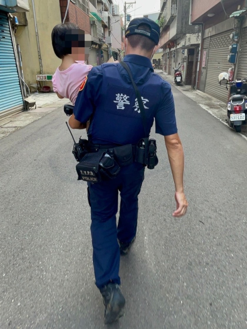10日午後14時許,中壢區龍岡路三段上一間修車廠的老闆走出店門口,看見不遠處有一個小女童蹲坐在路邊,但觀察周遭都沒有大人陪伴,日正當中女童還赤著腳,便趕緊將女童帶進室內提供果汁解渴並報警請求協助。中壢警分局龍興派出所警員莊守翔、古泓接獲報案到場,女童面對詢問只是用她圓滾滾、水汪汪的雙眼看著大家,還不善言語,育有兩幼女的莊員這時父愛噴發,一把抱起女童溫柔安撫,並承諾一定安全送女童返家,員警目測女童約2歲且沒穿鞋,研判應該走不遠便挨家挨戶詢問。