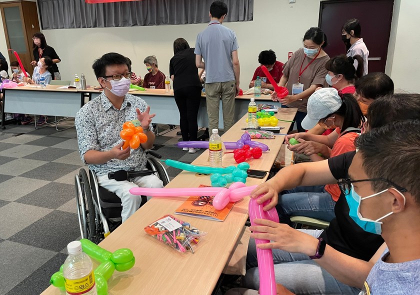 氣球達人劉炫成(坐輪椅者)帶領學員一起化身造型氣球師,一起玩創意。