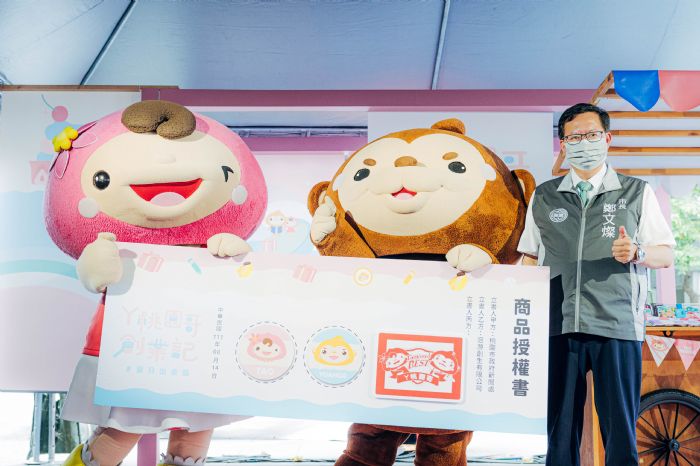 桃園市長鄭文燦14日下午前往中壢區,出席「ㄚ桃園哥創業記-全新官方授權商品發表會」。鄭市長表示,桃園市吉祥物ㄚ桃、園哥於104年推出,可愛熱情的形象,深受市民朋友喜愛,截至目前,ㄚ桃、園哥已受邀出席超過396場活動,及超過302案的圖像授權。109年8月市府開始進行ㄚ桃、園哥品牌化,並開放授權商業使用,目前已授權業者製作ㄚ桃園哥口罩、絨毛娃娃、市民卡套、野餐墊、徽章、主題套房等多樣商品,本次市府再與雄獅想像力製造所、馬卡諦義大利冰淇淋及灣得文創共同合作,推出「ㄚ桃園哥限定色蠟筆組/色筆組(12色)」、「挺桃園特別版」冰淇淋禮盒,以及用ㄚ桃、園哥圖樣所設計製作的T恤、帆布包、隨身袋等商品,讓ㄚ桃、園哥成為桃園人生活中的一部份。