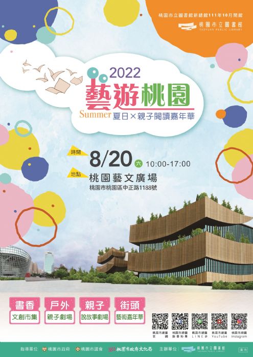 桃園市立圖書館新總館即將在今年年底於桃園藝文廣場落成,為了讓廣大民眾搶先熟悉新總館周邊區域,桃園市立圖書館於8月20日在桃園藝文廣場特別舉辦「2022藝遊桃園夏日x親子閱讀嘉年華」活動,現場將有書香文創市集、yoyo家族戶外親子劇場、展演大型繪本的親子說故事劇場、街頭藝術嘉年華等豐富活動,期望以熱鬧精彩的嘉年華慶典讓大家一窺桃園市立圖書館新總館的神祕面貌!