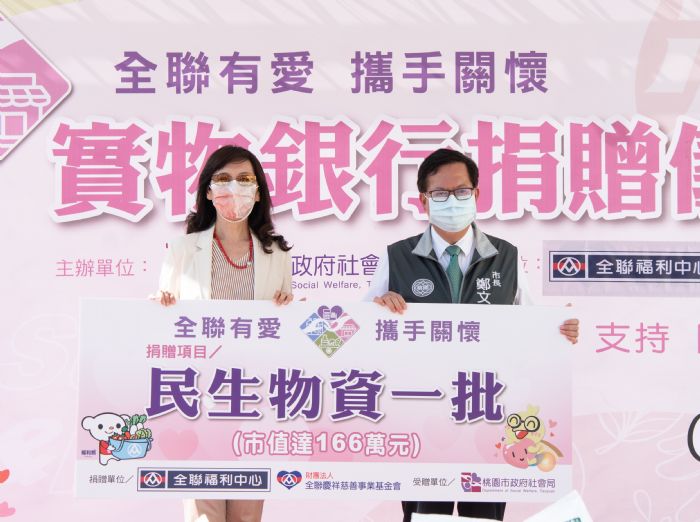 桃園市長鄭文燦23日下午前往桃園區,出席「全聯有愛,攜手關懷」實物銀行物資捐贈儀式。鄭市長表示,全聯福利中心已成為台灣人生活的一部分,且相當熱心公益,自106年起開始捐贈本市安家實物銀行物資,今(111)年再次捐贈友善貼心用品、洗髮精及沐浴乳、成人紙尿褲等民生用品,市值逾166萬元,累計捐贈已超過551萬元,共同守護弱勢家庭的用心,外界都可以感受到這份溫暖。