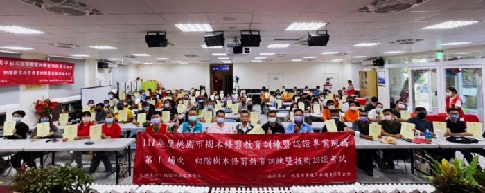 為提升桃園市景觀樹木的健康與美質,增進第一線樹木修剪作業人員技能,工務局於111年8月至9月辦理2梯次教育訓練及認證考試,每梯次舉行為期2天的「景觀樹木修剪技術教育訓練」及「樹木修剪認證考試」,經考試及格始得發給合格證,桃園市執行樹木修剪作業人員必須持有合格證才能執行公園綠地行道樹木的修剪作業,藉以維護景觀樹木的修剪品質,促使本市的環境景觀更加美麗。