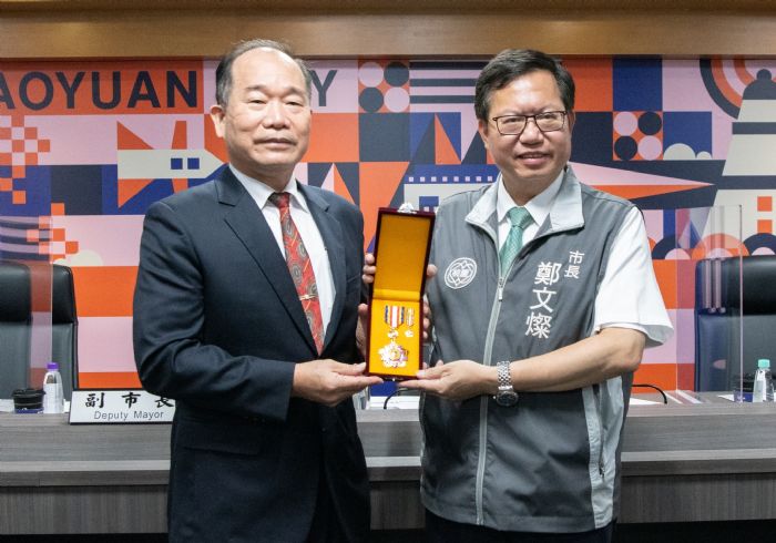 桃園市長鄭文燦24日上午主持市政會議,表揚桃園市政府警察局陳國進前局長榮獲行政院三等功績獎章。鄭市長表示,陳前局長在擔任警察局長任內,傾聽同仁心聲、鼓舞士氣、運用創新思維提升執法效能,也讓警察成為政府的骨幹及人民的保姆,獲得市民高度的信賴,因此市府特別向行政院請頒三等功績獎章。鄭市長肯定陳前局長的貢獻,堪稱是守護市民的最佳典範。
