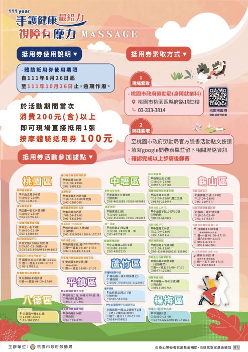 為回饋支持本市視障按摩的市民朋友,桃園市政府勞動局透過發放按摩體驗抵用券方式讓民眾親身體驗按摩的好處,增加按摩師新客源,希望大家一同共襄盛舉。