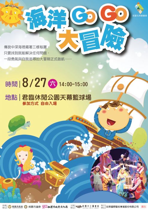 8月27日在八德區君臨休閒公園天幕籃球場上演《海洋GO GO大冒險》兒童舞台劇,桃園市立圖書館特別邀請由水果奶奶——趙自強帶領的《如果兒童劇團》,讓大家留下難忘的夏日美好看戲回憶!奇幻的冒險、酷炫的海盜和海盜船、驚奇大章魚還有許多有趣的海洋生物!劇情中可愛活潑的皮皮在海邊玩時,隨意亂丟垃圾。竟然被住在海中的小星星帶到海底!原來海底世界住著海族人,他們一直受到垃圾的傷害,為了恢復海洋以往的美麗,小星星與皮皮必須找到大海中的3樣秘寶,傳說這3樣祕寶可以解決眼前任何問題。這趟冒險中將會有什麼困難在等著他們呢?快來幫助小星星和皮皮一起度過難關吧!