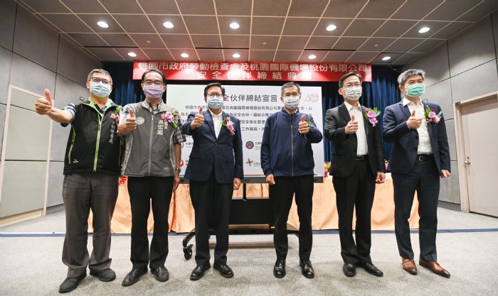 桃園市長鄭文燦26日上午前往桃園國際機場,出席「桃園市政府勞動檢查處及桃園國際機場股份有限公司安全伙伴關係締結典禮」,在鄭文燦市長及交通部技監張垂龍的見證下,由市府勞動檢查處長李賢祥與桃園國際機場公司總經理范孝倫共同簽署締結意願書及安全伙伴宣言。鄭市長表示,桃園國際機場作為我國國門,每日來往旅客眾多,又正值擴建階段,有必要提升機場園區整體的職場安全。有鑑於此,市府勞動局與勞檢處今日攜手桃機公司,共同簽署「安全伙伴宣言」,採取「中心夥伴、衛星夥伴」的模式,納入機場園區內200多家協力廠商,透過教育訓練、派員臨場診斷、舉行經驗交流座談等多項預防性措施,期盼在日常運作中落實職場安全,保障機場同仁的安全,達成「零災害、零事故」的最高目標。