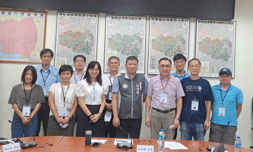 楊梅區長邱世源與《桃園市楊梅區志》總編鄭政誠教授組成的編纂團隊合影。