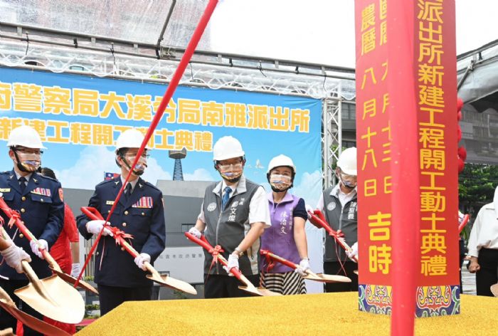 桃園市長鄭文燦13日下午前往大溪區,出席「桃園市政府警察局大溪分局南雅派出所新建工程開工動土典禮」。鄭市長表示,大溪南雅派出所早期位於普濟路9號,後遷移至警政戶政合署辦公大樓,1至3樓為南雅派出所,4至6樓為大溪戶政事務所。現因人員擴編,導致辦公廳舍空間狹小,不敷使用,且位於舊市區,民眾停車洽公不易。因此,市府於大溪都市計畫區內,擇定原廢棄之警察宿舍用地,新建大溪南雅派出所,基地面積達356.95坪,規劃地上3層、地下1層之建物,樓地板面積達680.65坪,並於1樓規劃辦公區,2、3樓規劃員警待勤室;建物外觀結合大溪木雕特色與警局形象,以浮舟、燈塔造型,象徵警察守護人民,點亮治安、點亮大溪的精神,完工後將能滿足員警執勤與備勤等需求,並成為大溪的警政新地標。