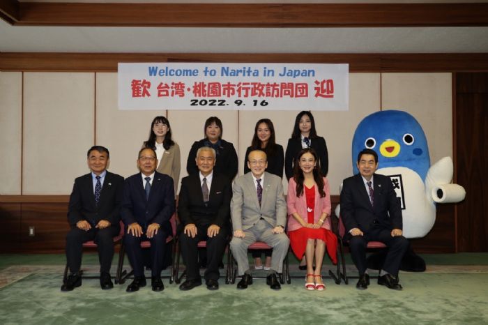 桃園市副市長高安邦(左三)率領世界客家博覽會團隊拜會成田市長小泉一成(右三),並一同合影。