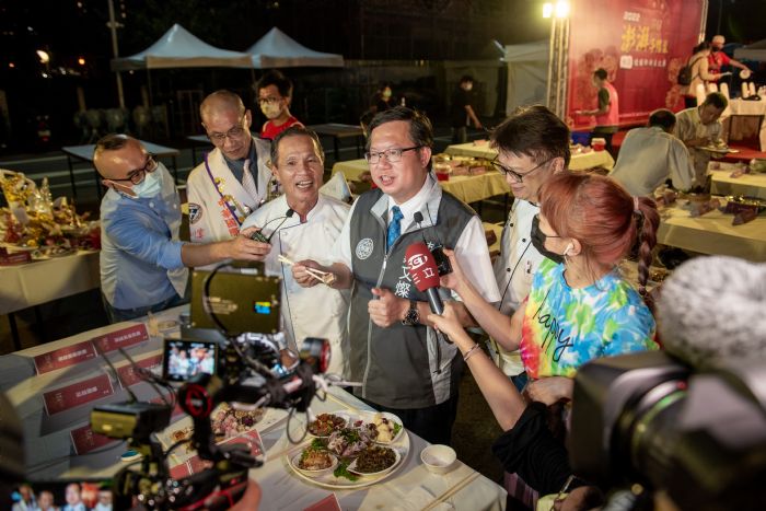 桃園市長鄭文燦17日晚間前往桃園區,出席2022桃園閩南文化節-「總舖師辦桌比賽」時表示,辦桌是台灣傳統飲食文化之一,每道菜餚皆散發濃厚的人情味,並充滿對新人的祝福。今年總舖師辦桌比賽,以「囍宴」為主題,由10組隊伍展現高超廚藝,爭奪最強總舖師頭銜及冠軍10萬元獎金。