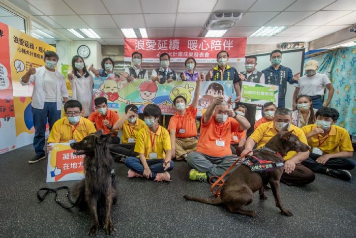 桃園市長鄭文燦20日下午前往大溪區,出席「浪愛延續,暖心陪伴」心輔犬計畫成果展。鄭市長表示,心輔犬意指「心靈輔助犬」,其多為經過專業訓練的流浪狗,在與自閉症學員互動、遊戲的過程中,讓他們能夠放鬆情緒,感受同理心與存在感,進而重拾學習動機與自信,是非常溫暖的治療方式。