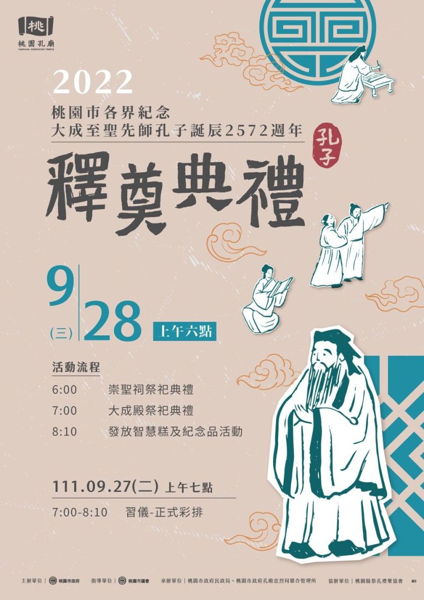桃園市孔廟為完成深具歷史意義及文化傳承之年度盛事,與本市各機關及學校共同投入眾多人力,包含現任及退休國中小校長、主任及老師們,由鄰近的桃園高中學生等擔任禮生及樂生,約計260人組成,多位校長都已執事典禮30多個年頭,持續以身教貫徹儒家文化精神,表達對先聖先賢之崇敬感念。