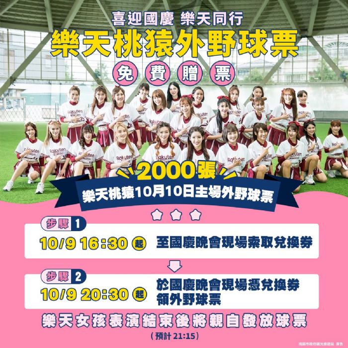 2022「守土衛國‧你我同行」國慶晚會在桃園,將於10月9日16時30分起開放民眾自由入場,進場即可獲得國慶限量紀念加油棒,憑桃園市民卡還可參加抽獎活動,最大獎為YAMAHA EC-05電動車1台,其他獎項包括華信航空澎湖、金門機票等。現場還有2,000張樂天桃猿10月10日主場外野球票要免費贈送給入場民眾,送完為止,邀請大家一起來桃園看棒球、迎國慶。