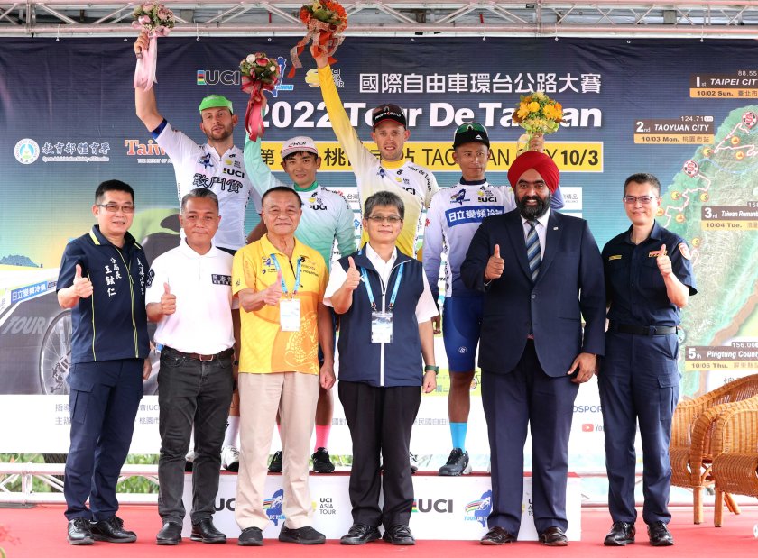 桃園市政府3日舉辦「2022國際自由車環台賽-桃園市站」,上午9時30分在桃園市政府前,由市長鄭文燦、亞洲自由車總會副會長Amarjit Singh Gill DARSHAN SINGH、中華民國自由車協會秘書長李開志等貴賓共同鳴槍,為賽事揭開序幕,周邊由西門國小、桃園國中、中壢國中、新興高中學生一同為選手加油,現場熱鬧非凡。