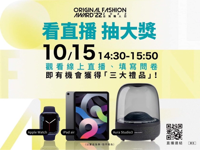 勞動部勞動力發展署桃竹苗分署衣啟飛翔創客基地 10月15日(六)將舉辦「2022台灣職人日—原創服裝大賞」活動,集結10個新銳服裝品牌動態走秀,以線上直播方式,將台灣優秀的創客及原創服裝介紹給市場大眾。為了號召民眾一同參與這場線上的時尚盛會,桃竹苗分署特別舉辦2波段抽獎活動,即日起至衣啟飛翔創客基地臉書粉絲專頁參加「首獎神預測」活動,就有機會獲得Airpods3;活動當天只要在直播過程中填寫線上問卷,還有機會獲得Apple Watch7、iPad air、Aura Studio3等時尚大獎,歡迎民眾一起上線支持台灣設計、觀看直播抽大獎!