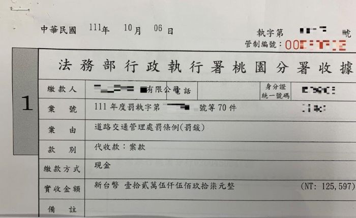 設址在桃園市中壢區之一間工業零件製造公司(下稱○○公司),欠繳交通違規罰鍰新臺幣(下同)3萬5,600元、違反水污染防治法罰鍰6萬元、違反職業安全衛生法罰鍰3萬元,合計12萬5,600元之罰鍰,均拒不繳納,經移送機關桃園市政府交通事件裁決處、環境保護局及勞動檢查處,自今(111)年6月起陸續移送法務部行政執行署桃園分署(下稱桃園分署)執行,桃園分署調查發現,○○公司為一間成立7年且現仍在營業中之公司,旋即扣押○○公司之貨款債權,○○公司得知貨款被扣押後,立即派員帶著12萬元的現金,至桃園分署現場一次繳清。