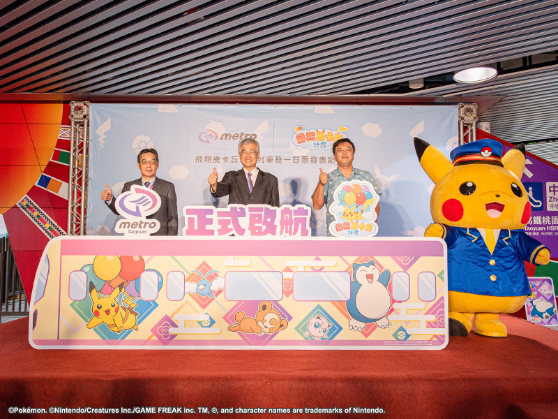桃園大眾捷運(股)公司董事長也是桃園市副市長的李憲明、總經理鄭德發及日本The Pokémon Company董事福永晋18日共同宣布,推出以寶可夢為主題的桃園機場捷運線「飛翔皮卡丘彩繪列車」及「寶可夢一日票」,並於21日正式啟航,為期一年至112年10月21日。