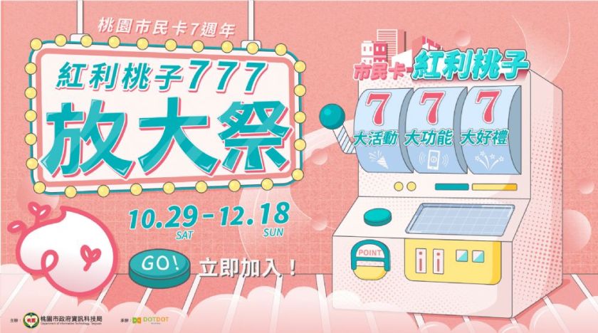 桃園市政府資科局為慶祝市民卡邁向7週年,10月29日至12月18日盛大推出「紅利桃子777放大祭」加碼振興活動,結合「幫助小頭家數位轉型」、「民眾拿點小確幸」、「點數消費助振興」活動目的,推出7大活動、7大好禮,不僅能在「桃園萬聖城」現場拿點數,還能透過捐發票、市政問答、小遊戲等線上管道天天拿點數;使用點數消費再抽Gogoro電動單車、日本雙人來回機票等總價值高達百萬的豪華大獎,邀請全台民眾參與同歡!