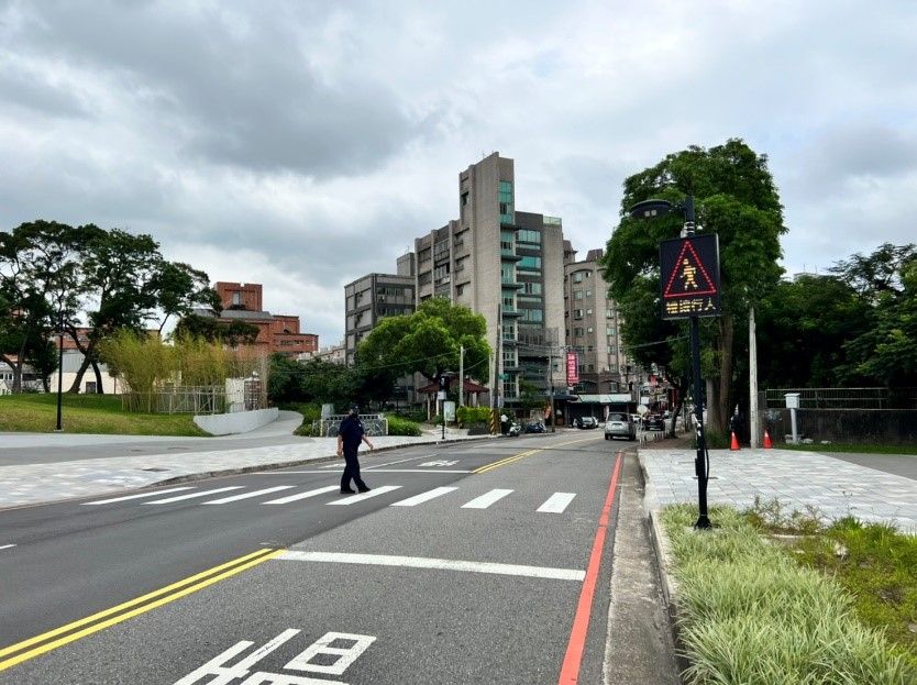 行人穿越警示系統完成照。(平鎮區1895乙未保台紀念公園(育達路))
