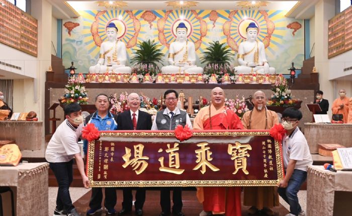 桃園市長鄭文燦24日上午前往桃園區,出席「桃園佛教蓮社2022藥師法會」,於佛前進行消災解結儀式,並致贈「寶乘道場」匾額。鄭市長表示,桃園佛教蓮社傾力推廣佛學教育70年,累積多代的智慧,且多次辦理共修、弘道,與桃園因緣深厚。桃園佛教蓮社不僅為桃園點一盞明燈,也看著桃園不斷改變,期許透過今日藥師法會,解開個人及國家的困難,讓台灣通過挑戰,也讓桃園持續進步,並祝福與會的同修蓮友平安如意,達成心中所願。