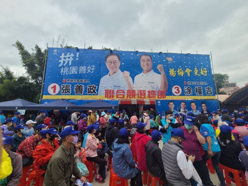 國民黨桃園市長候選人張善政與市議員候選人涂權吉,29日上午於楊梅區中山北路一段494巷(金山停車場) 舉辦聯合競選總部成立大會,滿場的支持者,揮舞旗幟,預祝張善政、涂權吉高票當選。張善政致詞指出,涂權吉把楊梅鄉親的小事情,當作就是他的大事情,他還關心楊梅楊的淹水、交通等民生問題,我跟他如果都能順利當選,我在市政府他在市議會,我們絕對是最佳拍擋。