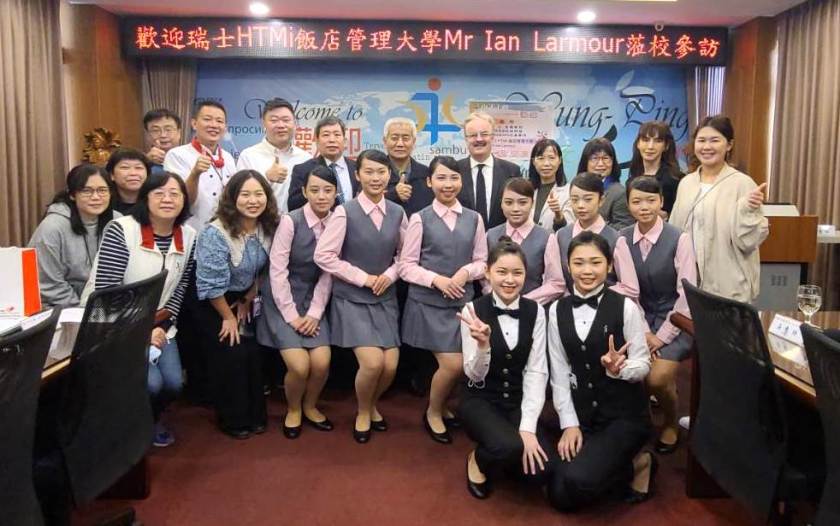 在兩校方進行簡報後,隨即到永平工商餐飲觀光大樓參觀實習餐廳與實作教室。校長Mr Larmour對於校內師資、設備讚譽有加。永平工商在台灣是餐飲觀光名校,學生在每年全國技藝競賽都獲得佳績,贏得國際能見度。校長Mr Larmour特別邀請永平工商學生暑期來HTMi參加世界廚藝競賽,也歡迎老師利用暑期來瑞士交流。