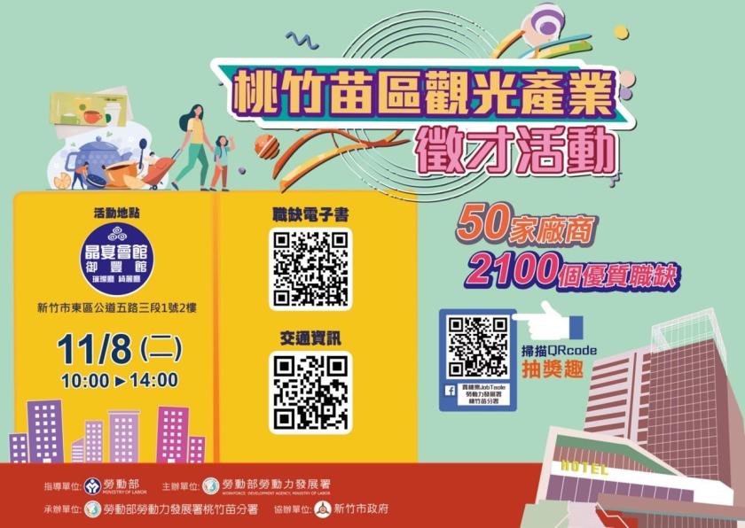 因應中央流行疫情指揮中心採行階段性開放邊境管理措施,勞動力發展署桃竹苗分署積極協助觀光產業補足人力需求,以及協助求職者覓得適合職缺,將於11月8日(二)在新竹市晶宴會館御豐館-璀璨廳、綺麗廳(新竹市東區公道五路三段1號2樓)舉辦桃竹苗區觀光產業徵才活動,共有50家廠商釋出2,100名職缺,最高薪資上看7萬元,歡迎民眾把握機會踴躍參加。