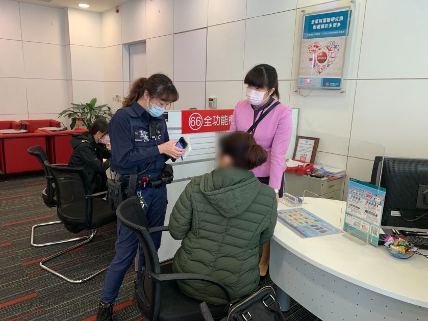 於是婦人拿著存摺及印鑑跑到銀行準備匯款新臺幣30萬元至對方指定帳號,但在填寫匯款單時,不斷的說電話,讓承辦的行員察覺有異,且婦人對行員的關懷提問完全置之不理,行員見狀趕緊通知警方到場協助,一起加入勸說婦人的行列。