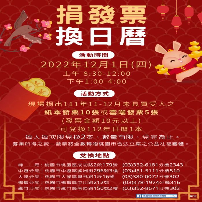 桃園市政府地方稅務局於111年12月1日(星期四)上午8時30分至12時、下午1時至4時舉辦「捐發票,換日曆」租稅宣導活動,在該局總局及中壢分局、大溪分局、楊梅分局及蘆竹分局4分局同時展開,邀您一起捐發票送愛心。