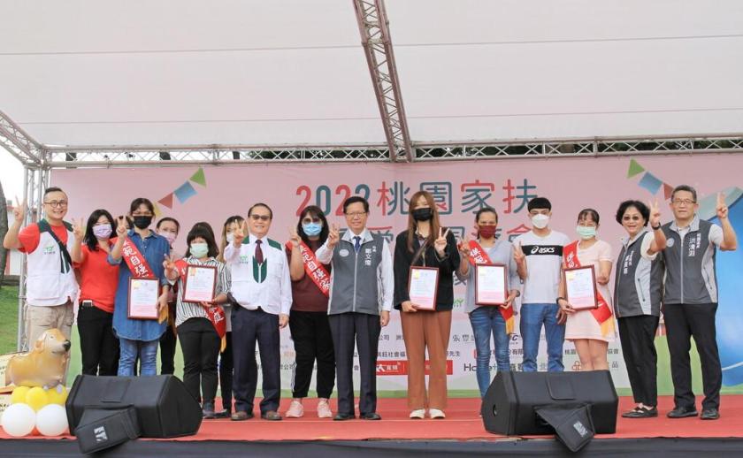 桃園市長鄭文燦(中)與桃園家扶中心扶幼主委陳鄭權(左七)與貴賓們與桃園家扶自強家庭合影。