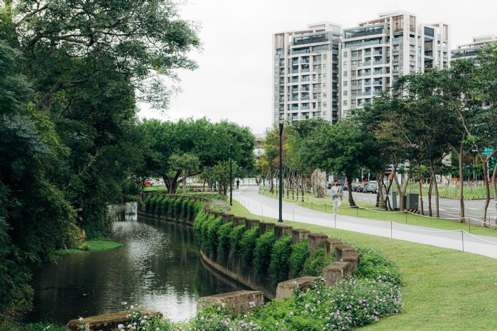 潘副局長表示,溪濱公園長度約1.6公里,整體空間以「九曲漫遊綠廊」概念進行規劃,除了目前開放的區域,公園南端也將設置入口意象,並於八塊厝人文園區的市定古蹟「著存堂」前方,設置栓馬柱形式的自行車架與特色街道家具,提供運動休閒民眾使用。