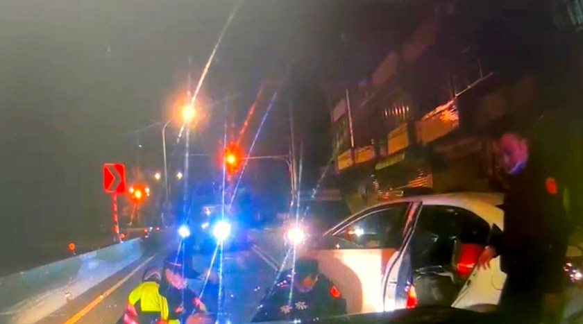 龍潭警方於5日凌晨執行威力掃蕩勤務時,行經龍潭區大同路段時,發現一輛白色自小客車形跡可疑,該車見警車靠近時突然逃逸,警方隨即尾隨查緝,過程中員警以擴音器、警報器示意停車受檢,不料犯嫌加速逃逸,警方考量如高速追車恐造成其他用路人危險,立即通報線上警網啟動攔截圍捕,運用技巧在該車輛行進路線前,管制人車並布署車陣,以避免嫌犯為了脫逃而衝撞逃逸。