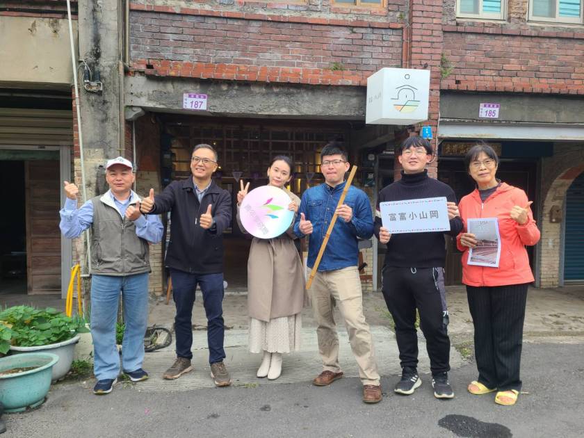 青年局長陳冠穎(左三)與「富岡創生協力隊」團員於楊梅區富岡老街的「富富.小山岡」基地合影。