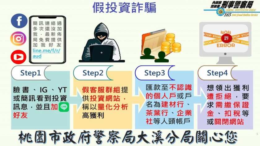 警方表示,歹徒利用臉書通訊軟體加入被害人成為好友,不時噓寒問暖展現關心,使被害人疏於戒心,過程中向被害人誆稱有投資穩賺不賠門路,要求被害人加入投資行列,被害人誤中圈套進而匯款投資遭詐騙,警方平時也利用各項機會進行詐騙宣導,期能讓民眾提高反詐騙意識,杜絕詐騙案件發生。