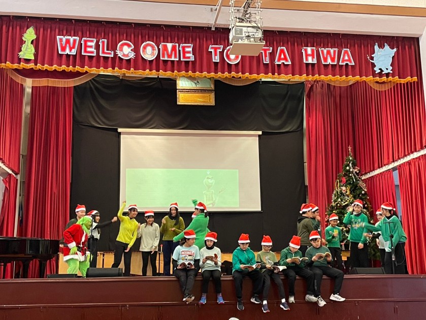 除了挑戰以詩歌朗誦方式,音樂、律動的藝術教育也是大華附小的另一特色,六年級孩子透過木琴、鐵琴、小提琴以及鋼琴的合奏,搭配人聲,呈現Dr. Seuss筆下不討喜又令人厭惡的Mr.Grinch綠毛怪。隨著韻律起伏,彷彿真實感受牠那讓人啼笑皆非的個性;現場另一高潮則是低年級的律動表演,詮釋繪本裡手持雨傘的靈貓、想擁有與眾不同身體部位的奇特男孩…,而最後的高潮則是二年級的竹竿舞,邀請現場來賓同樂的氣氛。