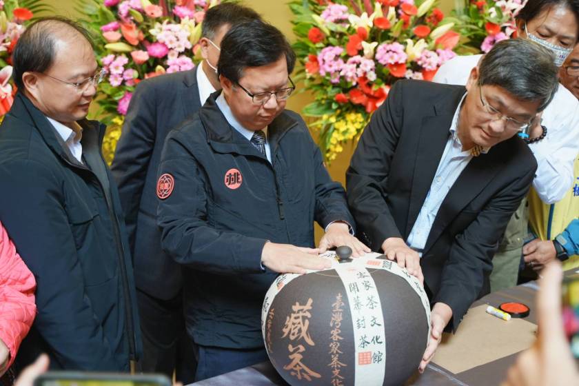 市長鄭文燦(中)、客委會主委楊長鎮(右)及桃園茶改場蘇宗振場長(左)共同進行藏茶儀式。