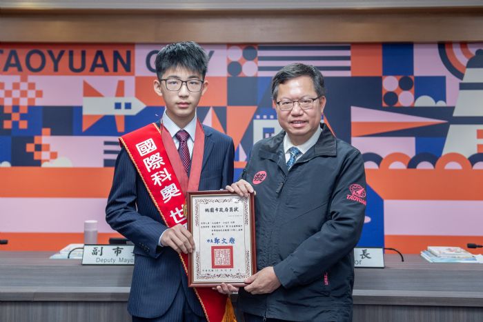 桃園市長鄭文燦21日上午主持市政會議,表揚大成國中王冠宇同學參加2022年「第19屆國際國中科學奧林匹亞競賽(IJSO)」傑出表現。鄭市長表示,2022年「第19屆國際國中科學奧林匹亞競賽」由哥倫比亞主辦,共有40個國家(地區)、203名學生參賽,我國於競賽中脫穎而出,共獲得2金4銀的佳績,其中大成國中王冠宇同學獲得金牌,表現相當優異,為本市爭光。