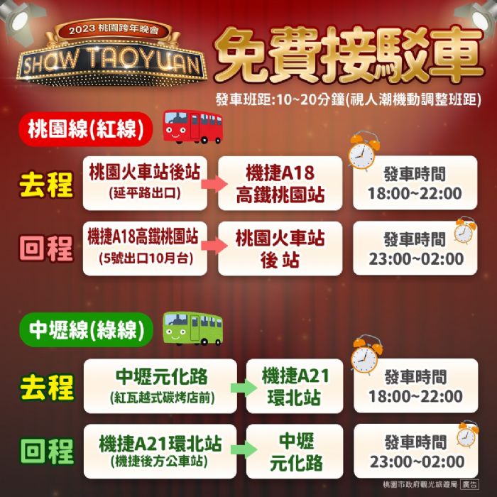 交通局呼籲自行開車前往的市民,離場時可行駛平面道路返家,避開前往高速公路返程之大量車潮;另外,本次跨年晚會計程車排班區設置於中壢區青園路、青境路(靠站前西停車場一側),離場時有需求的民眾亦可前往搭乘。