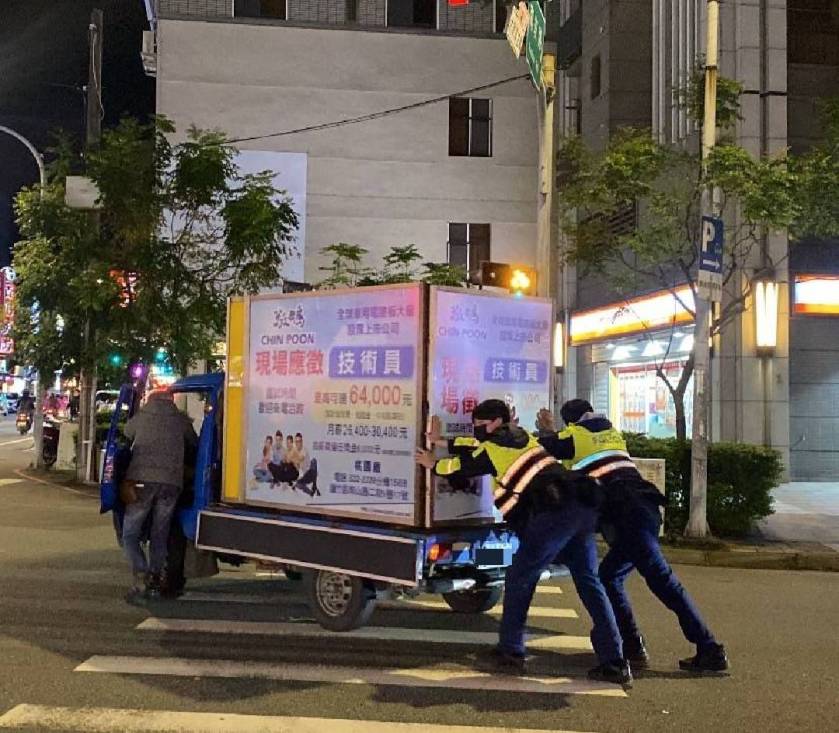 4日晚間19時許,1輛小貨車意外在道路上拋錨,造成後方車流回堵,駕駛著急的向後方車輛揮手求助,但是車輛紛紛閃避直行,所幸員警巡邏經過發現,幫忙將車輛推至路旁,才緩解男子燃眉之急,並且恢復了交通。