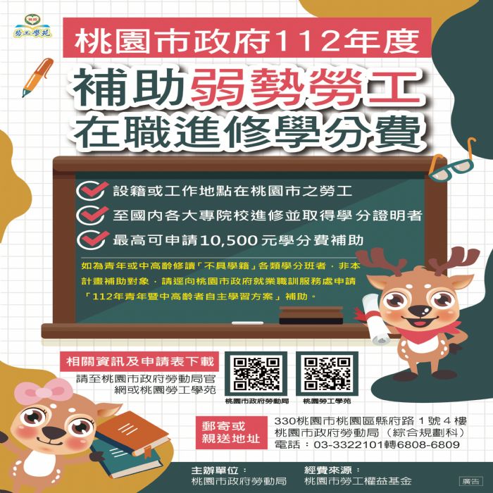 為鼓勵桃園市弱勢在職勞工重回校園完成學業,提昇職場專業知能,增強就業競爭力並保障工作權利,桃園市政府自106年開辦補助弱勢勞工在職進修學分費計畫,於106至111年度已補助1,366人次,112年度持續受理補助申請。凡設籍或工作地點在桃園市之在職勞工,符合弱勢勞工條件其中一項(如獨力負擔家計者、中高齡者、身心障礙者、原住民、低收入戶或中低收入戶中有工作能力、二度就業婦女、家庭暴力被害人、更生受保護人、新住民及因故辦理休學致未完成專科以上學業者等),即可提出申請。