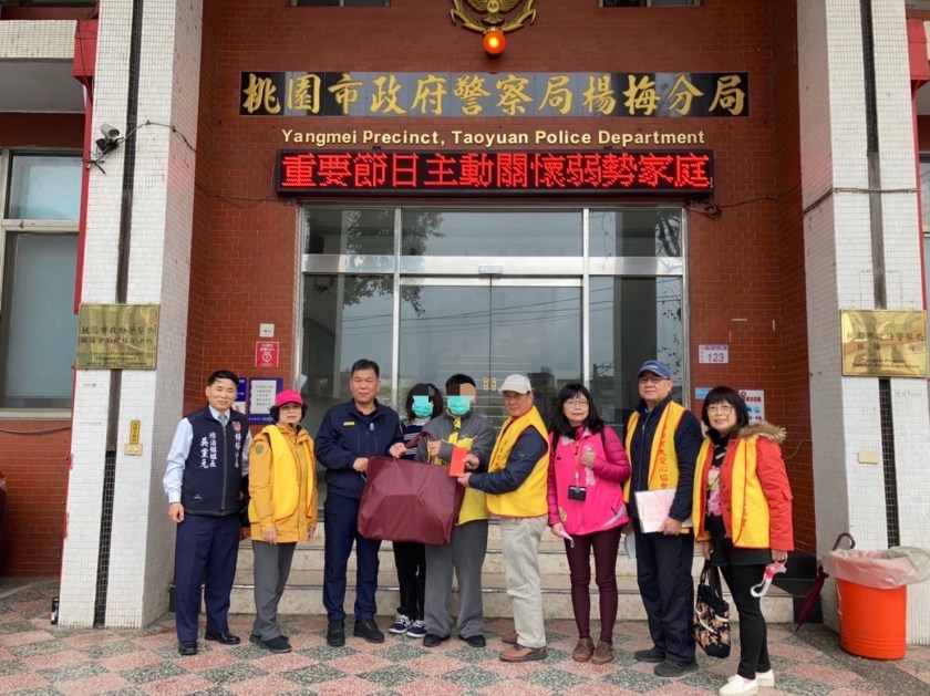 楊梅警分局指出,該分局防治組組長吳黨元及家防官陳毅樺主動與協會訪視得知轄內有15戶家庭生活困苦的弱勢家庭或獨居長者並積極協助轉介,因適逢春節前夕除了由世大愛心協會致贈15戶各扶助金新臺幣5,000元外,分局也代為發放知名企業耆盛食品負責人鄭介修、巧福麵包負責人黃炳欽等共襄善舉所捐贈的食品物資一大袋,希望能協助民眾稍解燃眉之急,平安過好年。
