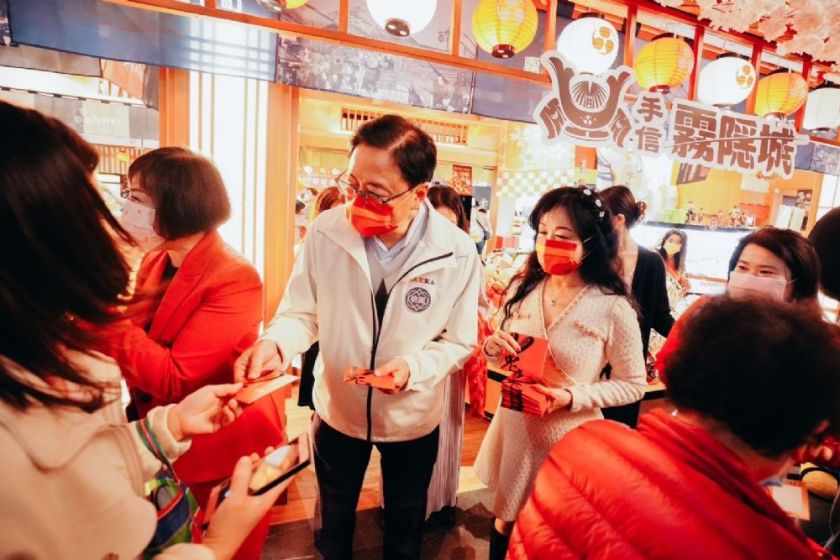 張善政於富田香草休閒農場及手信霧隱城均發送福袋,吸引許多到訪的遊客一同分享兔年滿滿的喜氣。張市長除了恭賀遊客新年快樂、闔家平安外,也分別在富田香草休閒農場餵食笑笑羊,體驗桃園農遊的魅力;並在手信霧隱城參觀「開運燒」製程及廠內所展售的各式特色伴手禮。