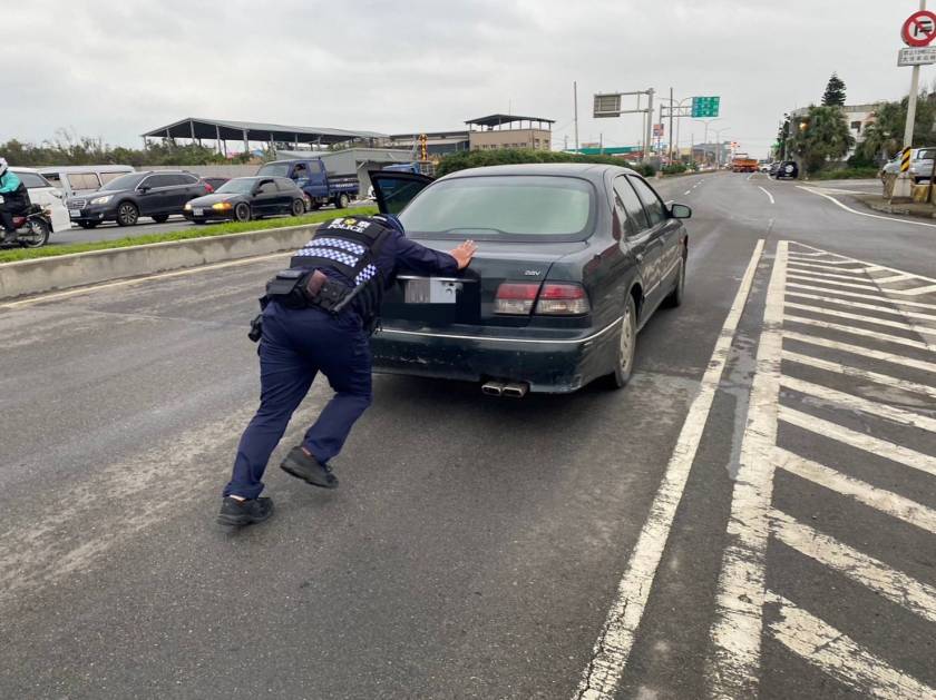 觀音所警員廖泫濡、石凱文獲報隨即到場,在拋錨車輛後方警戒及疏導交通,並利用車用電源試著協助發動車輛,但嘗試幾次後仍舊無法發動,員警便先將車輛推至路旁避免發生追撞事故,同時協助通知修車廠人員前來維修,總算讓拋錨車輛順利發動,男子感謝員警的熱心幫忙。