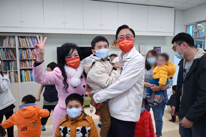 張市長在育德兒童之家與孩童溫暖互動,並逐一發送新春福袋給孩子,祝福他們新年快樂,孩子們也回贈親手寫的春聯,且一起合唱一首歌送給張市長,隨後張市長也和孩子們一起隨著音樂跳起可愛的舞蹈,現場氣氛十分溫馨。